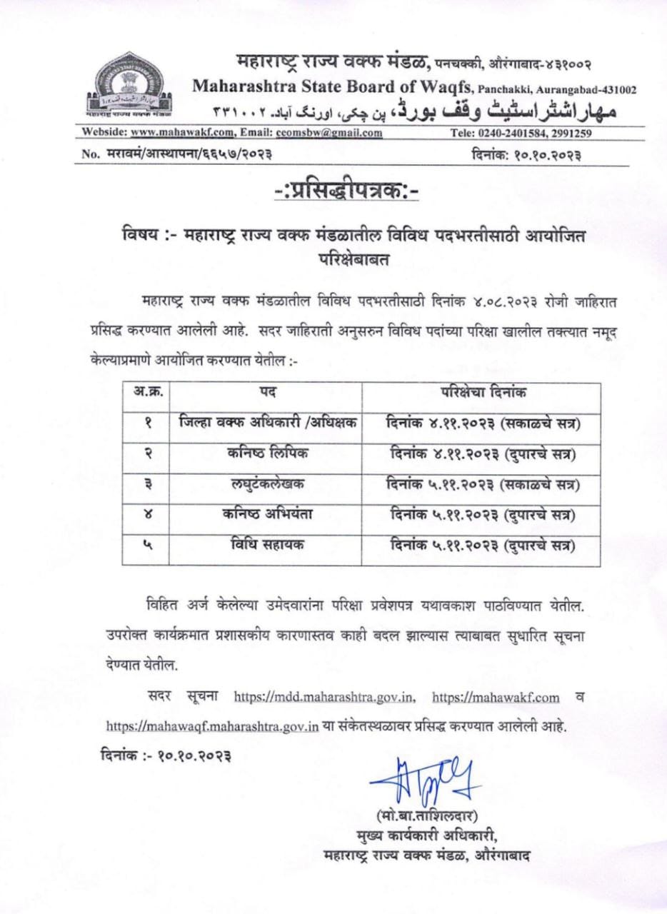महाराष्ट्र राज्य वक्फ मंडळ परीक्षेची तारीख 2023 अधिसूचना.